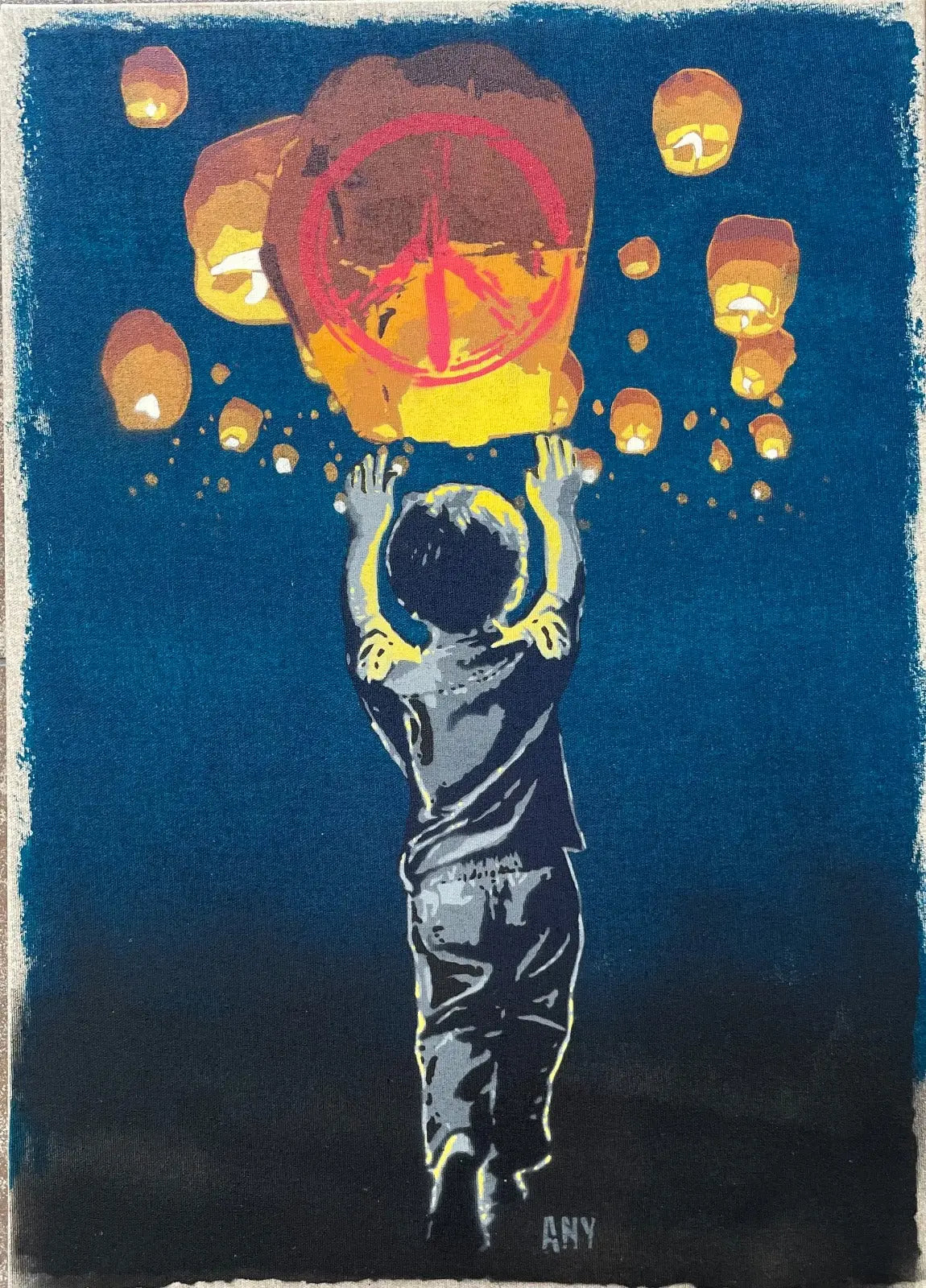 Spotlight Pink by Any captures the ethereal beauty of a ballerina against a deep pink background, combining the elegance of dance with the expressive power of street art.