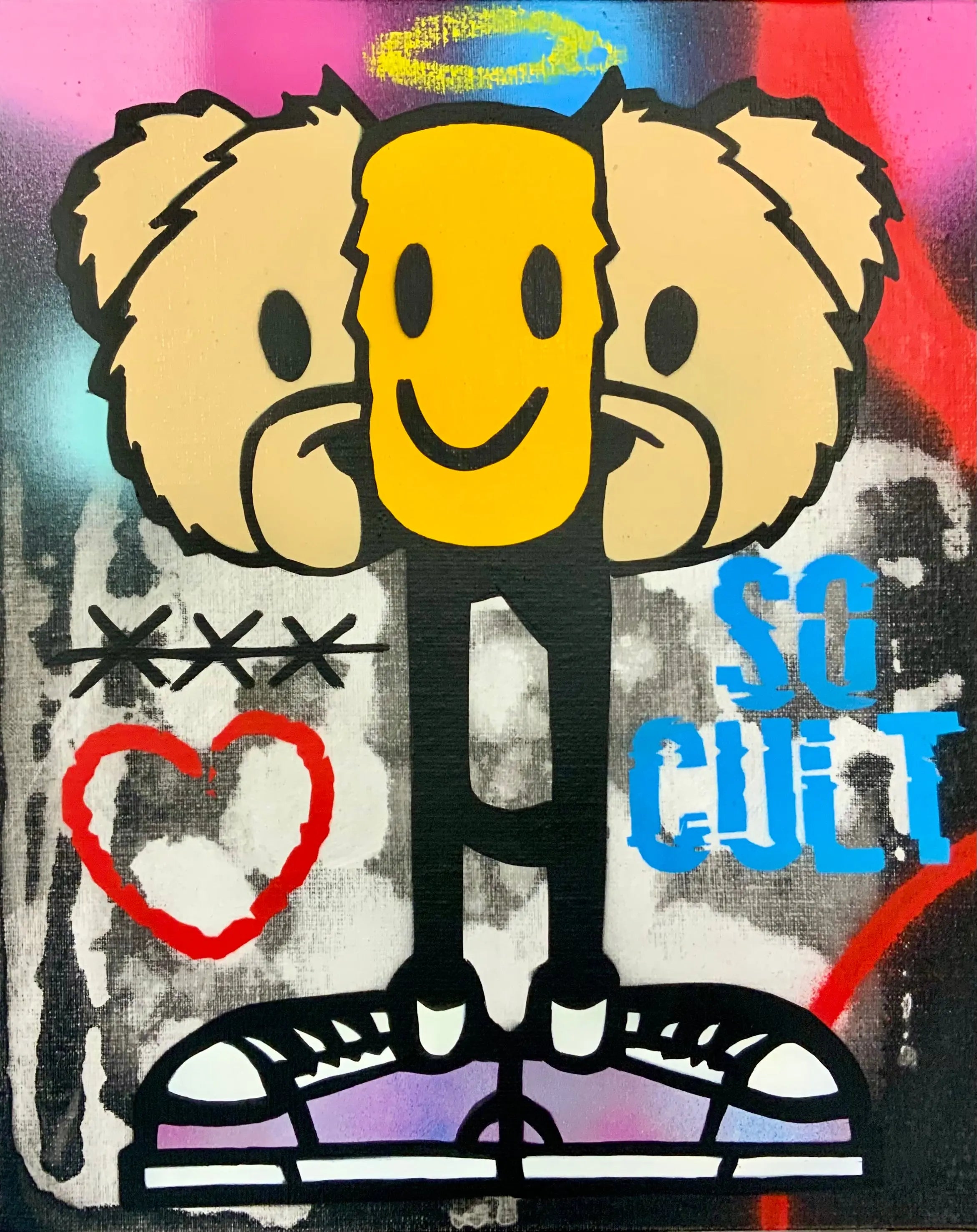 Bear Smiley di David Karsenty è un’opera unica su tela che raffigura un personaggio con tre teste d’orso e volto smiley, trasformato in simbolo pop tra sneakers oversize, graffiti urbani e scritte iconiche su fondo fluo e testurizzato.