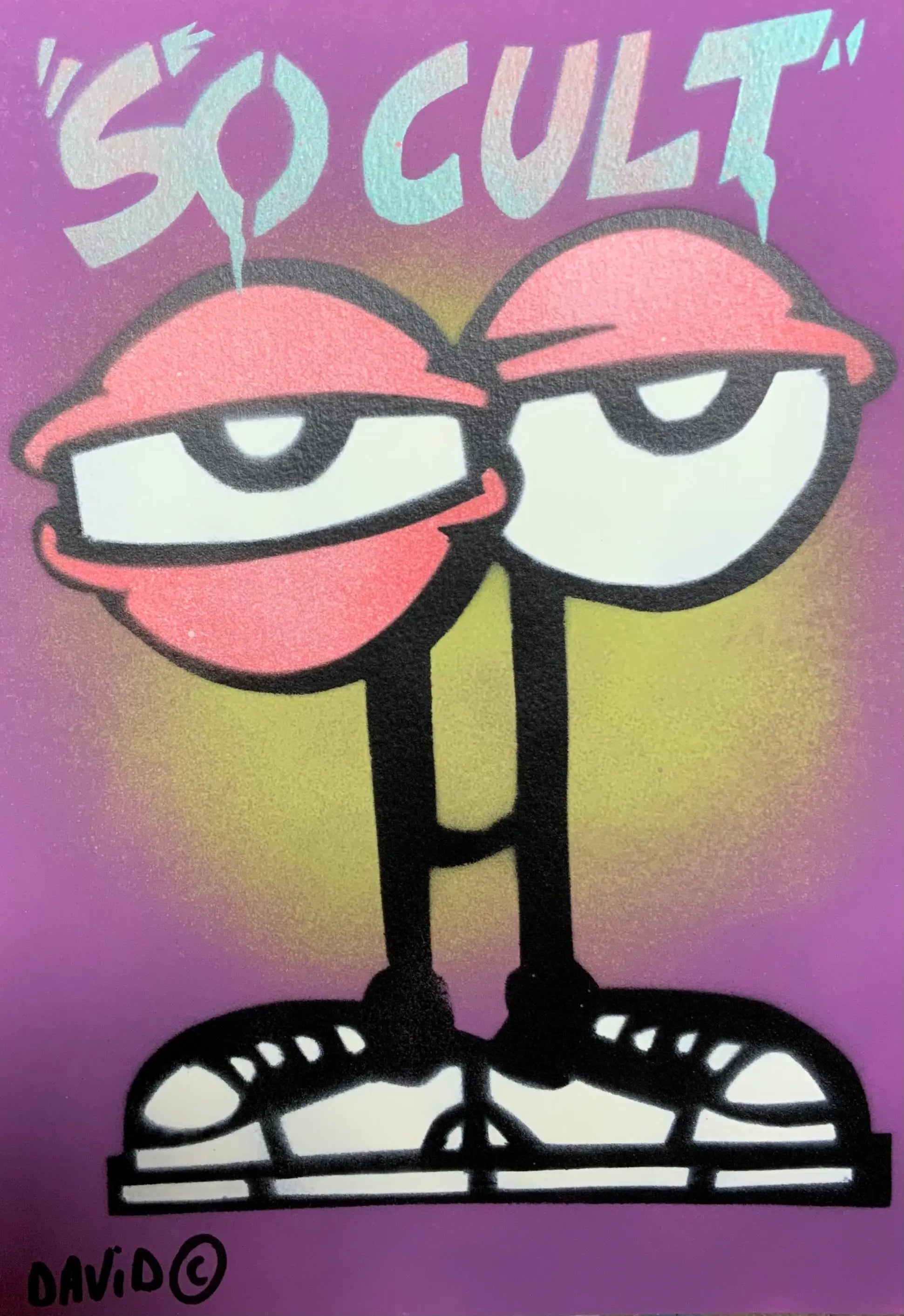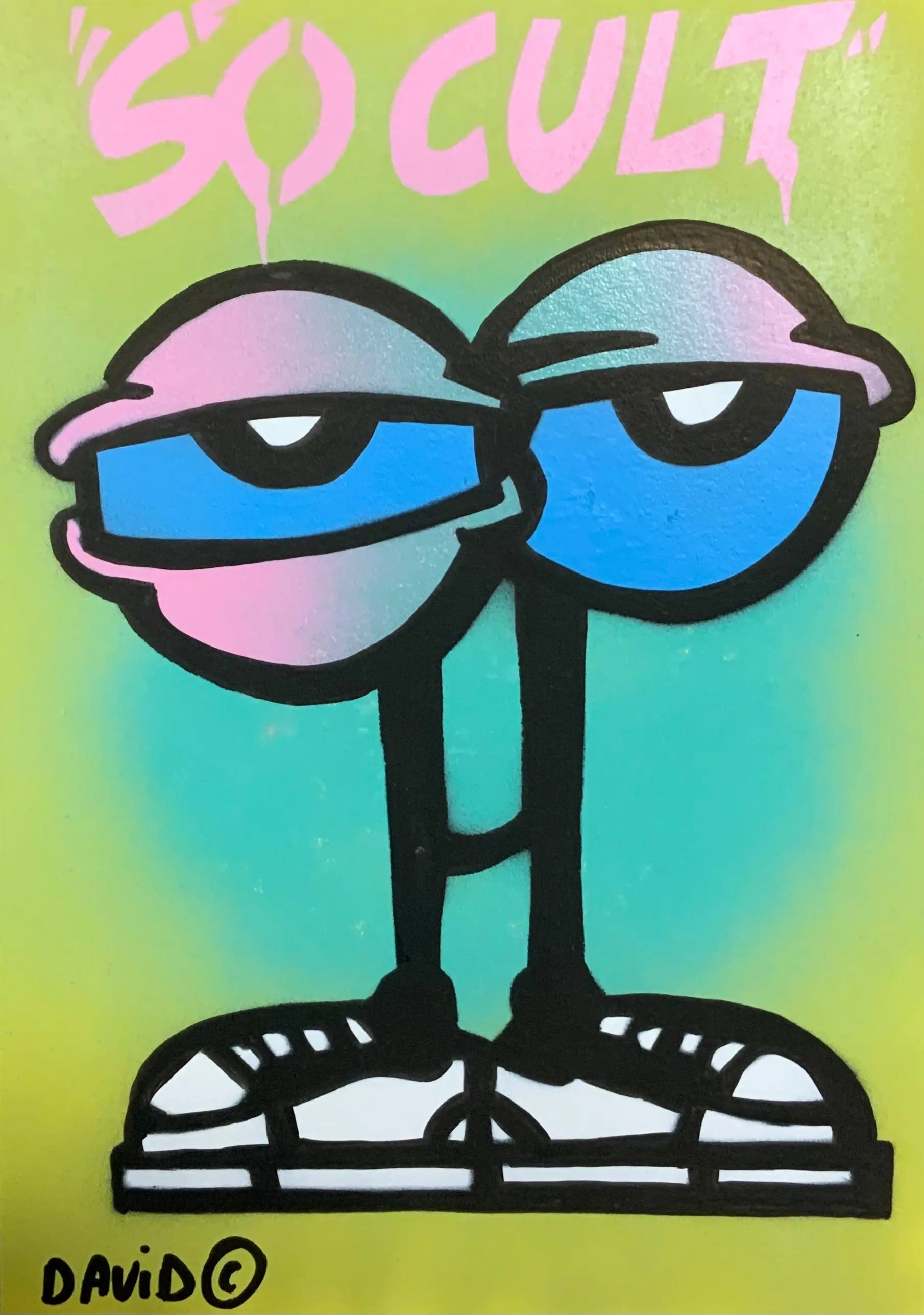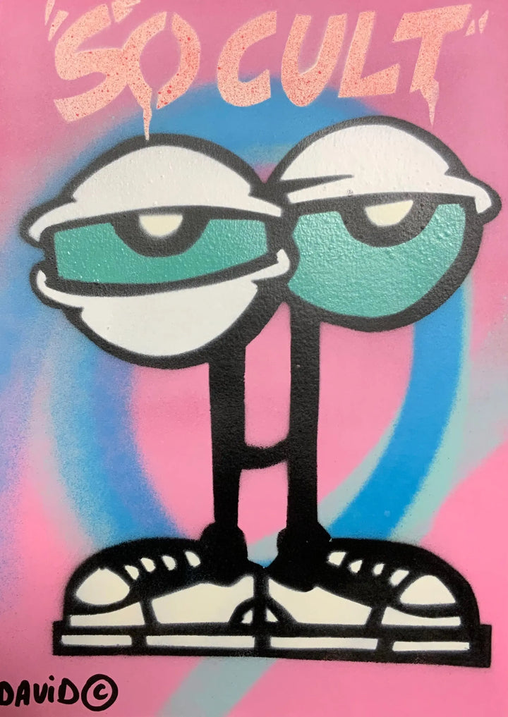 Big Eyes di David Karsenty è una stampa su carta che raffigura un personaggio stilizzato con enormi occhi espressivi e sneakers oversize, trasformato in icona pop tra ironia urbana, estetica cartoon e scritta “SO CULT” su fondo spray.