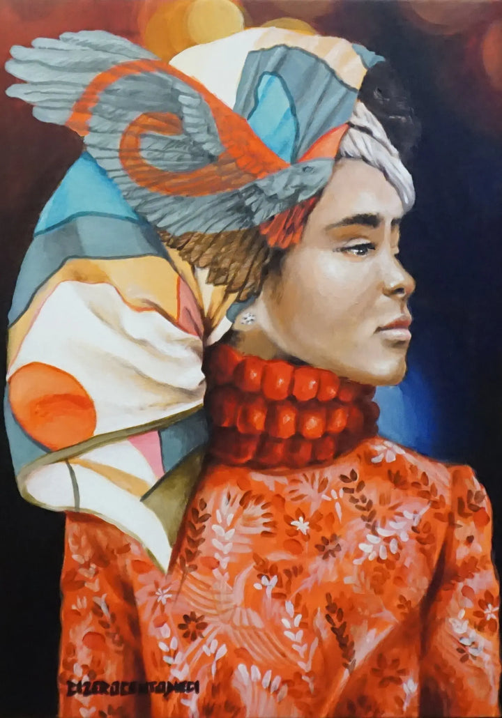 Dea di C0110 è un ritratto elegante che celebra identità e fierezza. I motivi vibranti del copricapo e dell'abito trasformano la figura in una presenza iconica, dove colore e postura evocano grazia, forza e consapevolezza.