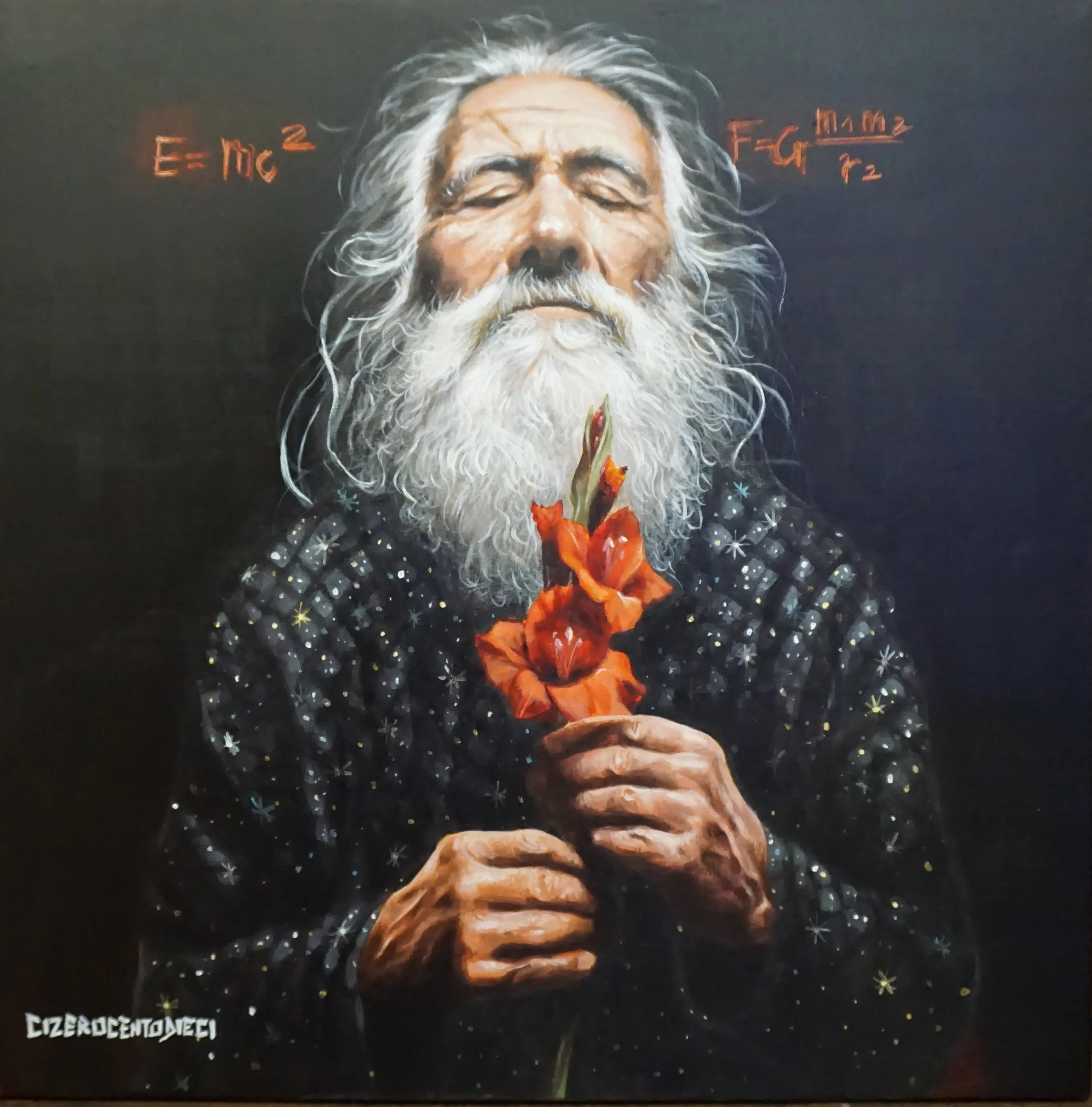 Equazioni Esistenziali di C0110 è un ritratto meditativo che unisce realismo e simbolo. Le formule e le stelle dialogano con il gesto semplice del fiore, trasformando la figura in un’icona di saggezza, equilibrio e ricerca interiore.