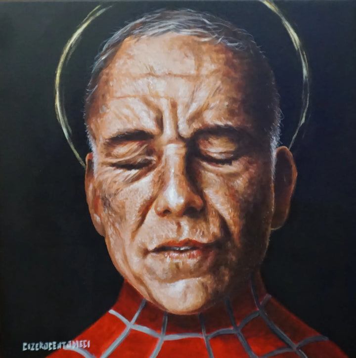 La Santità dei Pesi di C0110 è un ritratto che unisce realismo e simbolo. Le rughe contratte e l’aureola luminosa trasformano la figura in un’icona contemporanea dell’eroismo quotidiano, sospesa tra fatica, responsabilità e dignità interiore.