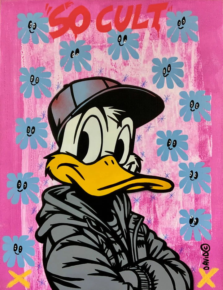 Maestro di David Karsenty è un’opera unica su tela che raffigura un’anatra antropomorfa in stile streetwear, trasformata in icona pop di carisma urbano, tra fiori stilizzati, colori saturi e scritte ironiche su fondo rosa.