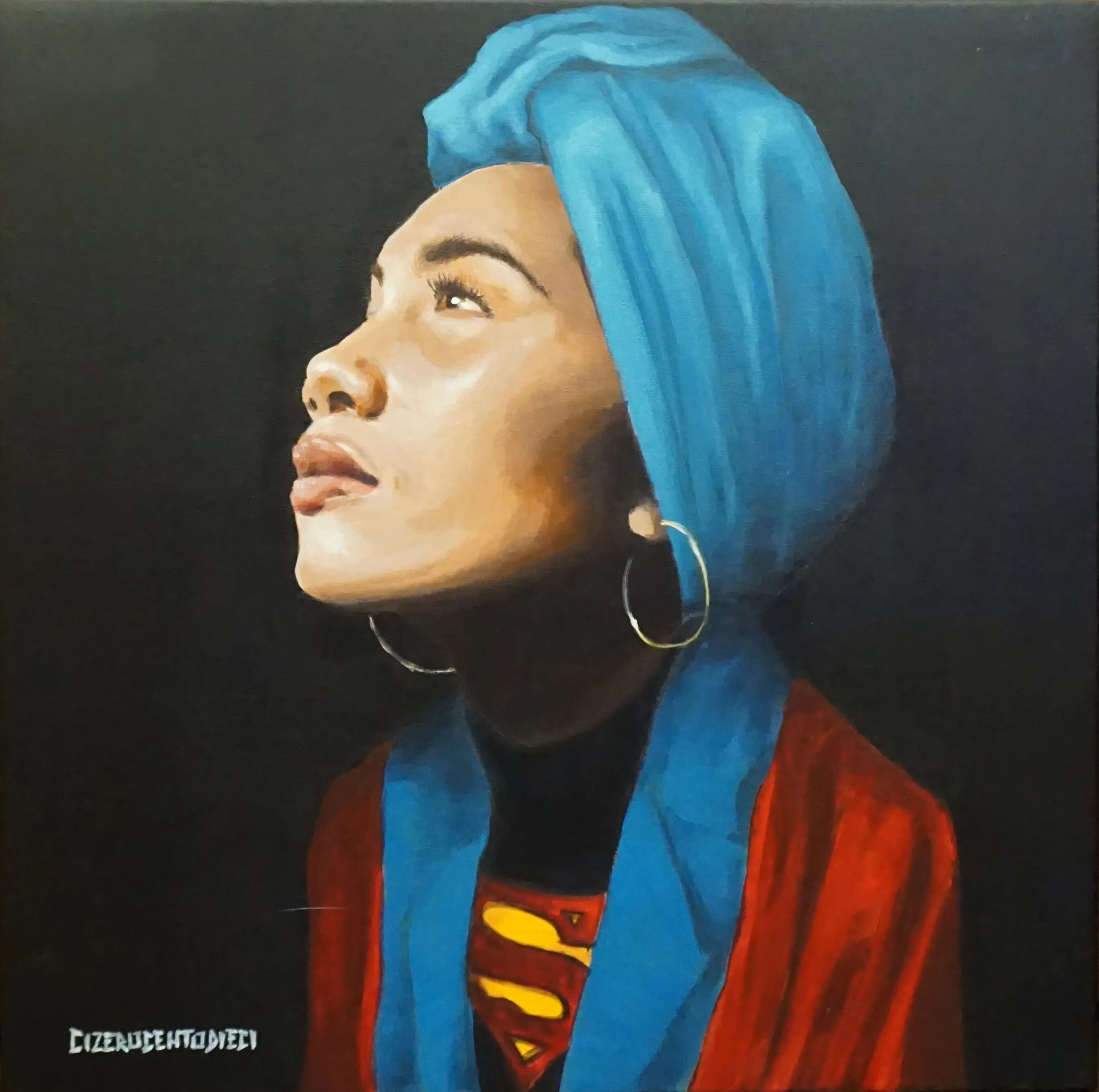 Orizzonti di C0110 è un ritratto che unisce realismo e simbolo. Lo sguardo rivolto verso l’alto diventa emblema di aspirazione e coraggio, mentre i richiami pop trasformano la figura in un’icona contemporanea di forza silenziosa.
