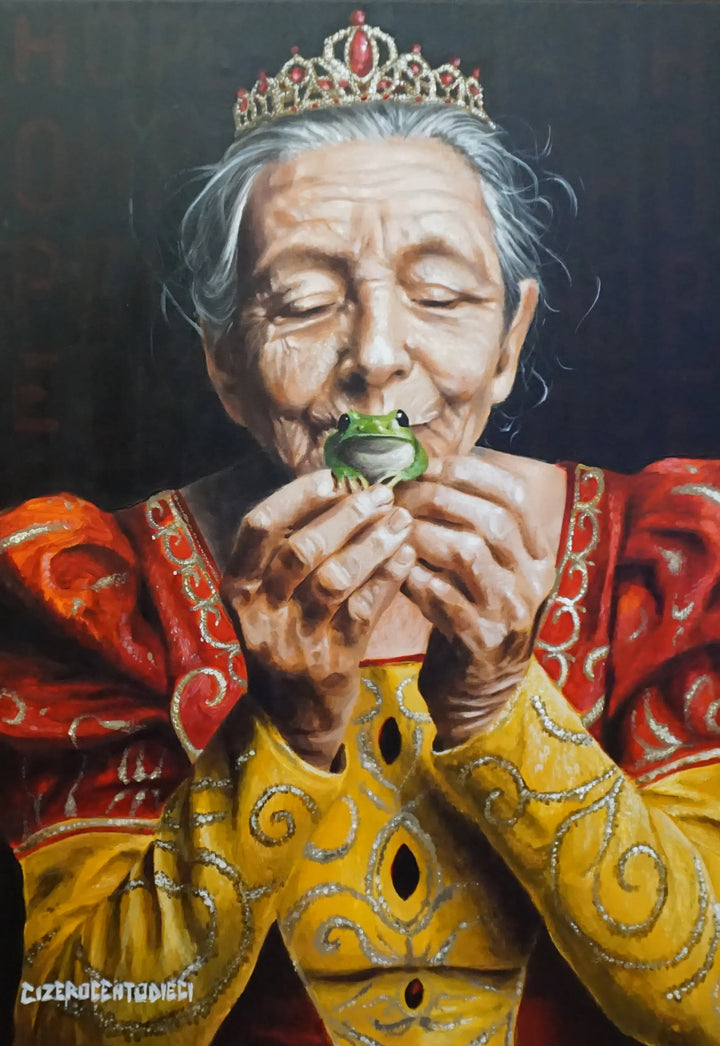Speranza di C0110 è un ritratto che unisce realismo e leggerezza simbolica. Il gesto affettuoso e la corona fiabesca trasformano la figura in un’icona contemporanea di gioia, saggezza e possibilità.