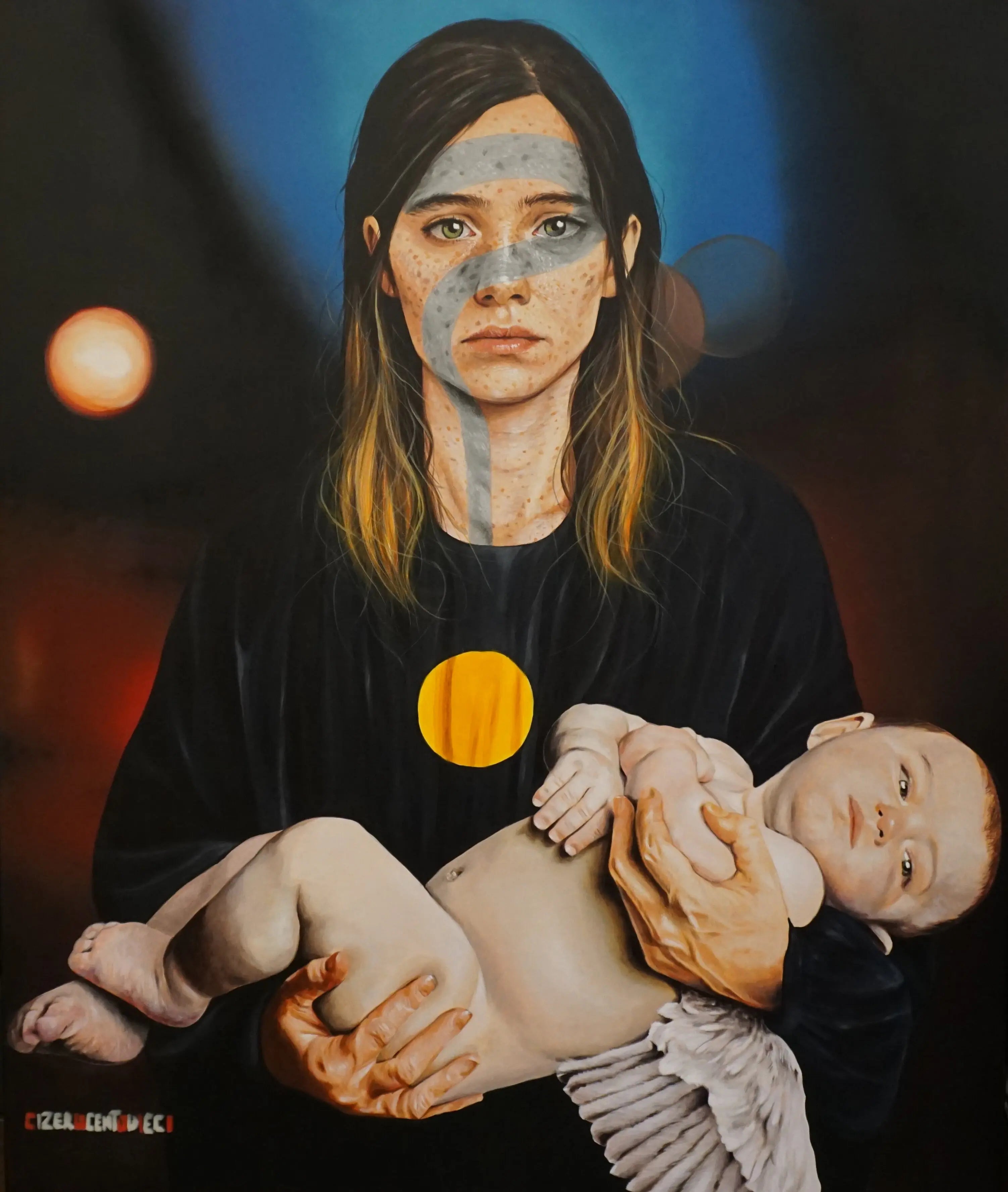 Ultimo Giorno a Gaza di C0110 è un ritratto che unisce realismo e simbolo. Lo sguardo ferito della giovane e il bambino tra le braccia trasformano l’immagine in un’icona contemporanea di dolore, innocenza e resistenza umana.